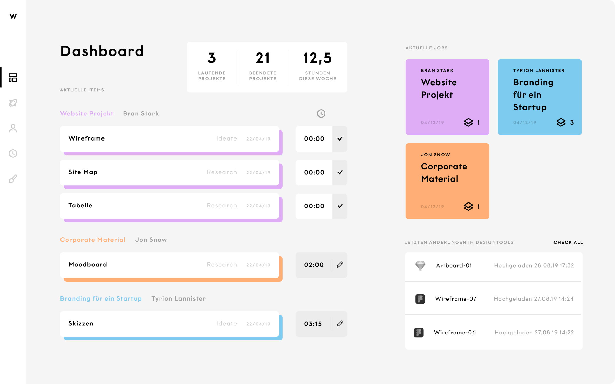 Das Jobboard gibt dir Kontrolle über deinen gesamten Arbeitsprozess. Erstelle Items für Briefing, Research, Ideenentwicklung, Design und dem finalen Launch.